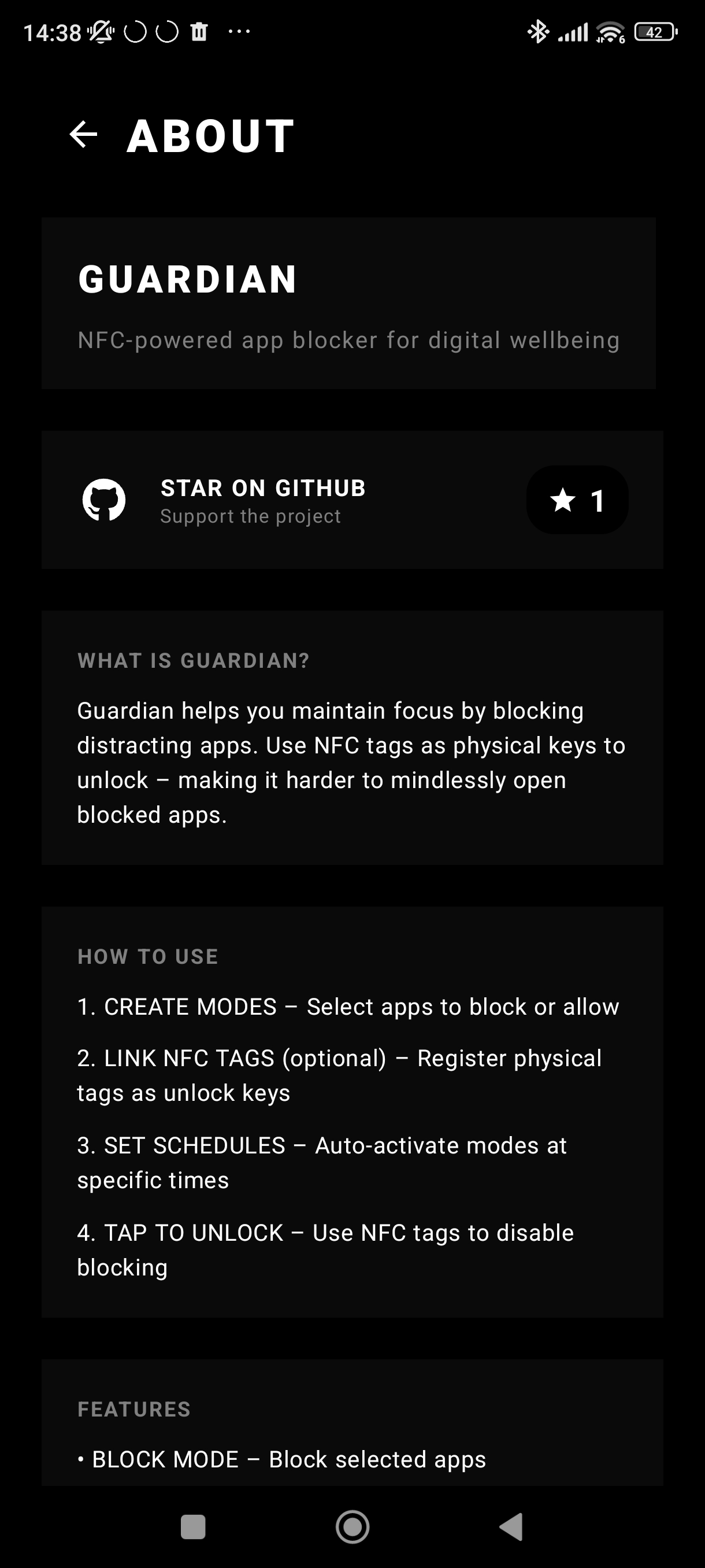 Android app for focused productivity using NFC-controlled app blocking and scheduled modes.